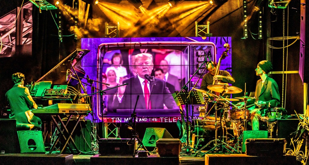 Een concert van Tin Men and The Telephone is een ervaring op zich met een slimme mix van beeld, geluid en social media. Als kijker en luisteraar word je meegezogen in een audiovisuele wereld waar absurdisme, humor en politiek engagement met een diepere boodschap elkaar op dynamische wijze afwisselen.